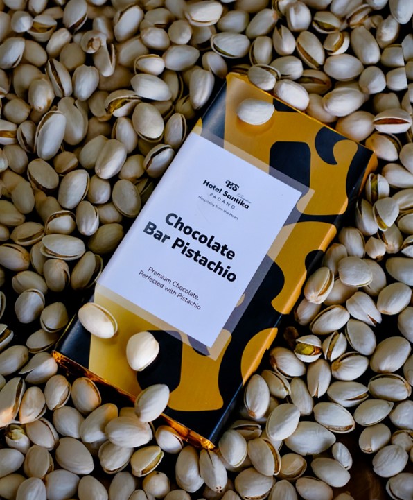 Padang, Khazanah — Hotel Santika Premiere Padang resmi meluncurkan menu terbaru Chocolate Bar Pistachio, sebuah produk cokelat premium hasil kolaborasi dengan Lile Chocolate, produsen cokelat lokal asal Kota Padang yang dikenal dengan pemanfaatan biji kakao lokal berkualitas tinggi dan pengembangan ekosistem kakao dari hulu ke hilir.